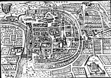 PIANTA DI TRENTO TRATTA DA UNA RISTAMPA DEI PRIMI DEL SETTECENTO VOLUME DI FRANCIS SCHOTT ITINERARIO DE' VIAGGI PRINCIPALI D'ITALIA (VENEZIA, 1679).