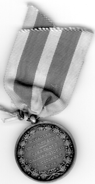 NELL'IMMAGINE SI VEDE UNA MEDAGLIA COMMEMORATIVA DEL TERREMOTO DI MESSINA (MEGLIO DETTO TERREMOTO CALABRO-SICULO DEL 1908) CHE VENNE ASSEGNATA AI MILITARI ITALIANI, PERLOPIU' SOLDATI DI MARINA INVIATI A SOCCORRERE LE SFORTUNATE POPOLAZIONI MERIDIONALI COME NEL CASO DI BARTOLOMEO DURANTE, NATO A PRA' DI GENOVA NEL 1888, SCOMPARSO A GENOVA PEGLI NEL 1978