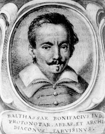 BALDASSARRE BONIFACIO, VESCOVO DI GIUSTINOPOLI, ERUDITO MARINISTA DICHIARATAMENTE ANTIFEMMINISTA E PARTECIPE DI POLEMICHE ERUDITE SULL'ARGOMENTO, QUI EFFIGIATO NELLE GLORIE DEGLI INCOGNITI.