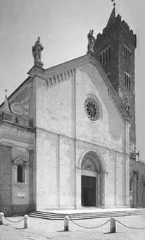 La Cattedrale di S. Maria Assunta, edificata sull'area dell'antica pieve di S. Basilio, fu definitivamente terminata nel 1474 con il compimento della parte superiore della facciata ad opera di L. Riccomanni, sulla quale più tardi (1735) furono aggiunte le statue di S. Eutichiano a sinistra, di Sergio VI a destra e di Niccolò V nella parte centrale.
