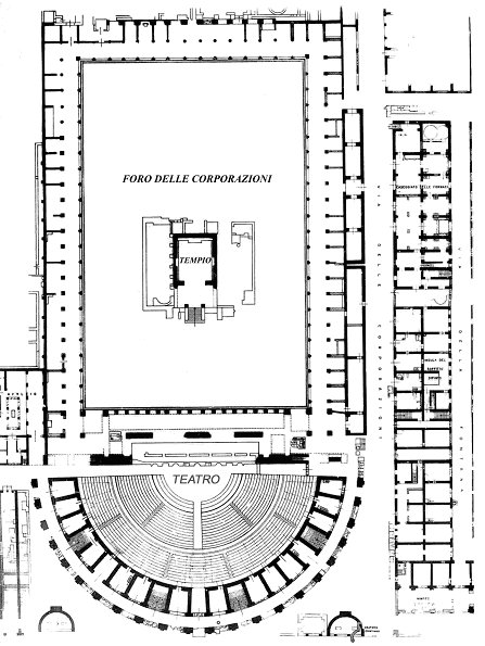 Alle spalle del TEATRO DI OSTIA, si trova un complesso (di cui si può qui sopra vedere la RICOSTRUZIONE PLANIMETRICA) non scoperto in nessun altra città romana: il foro, un portico quadrangolare, con due file di colonne di tipo dorico.