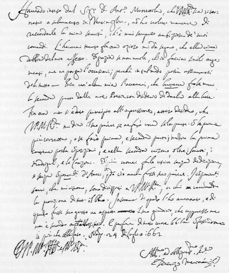 "Havendo inteso dal Signor Antonio Muscettola, che Vostra Paternità Molto Reverenda sia ritornata a salvamento in Ventimiglia, non ho voluto mancare di raccordarle la mia servitù, ch'è mai sempre ambiziosa de' ambiziosa de' suoi comandi...".