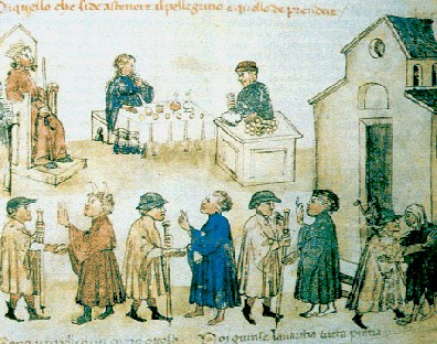 Nella miniatura del XIV secolo è rappresentato il VIAGGIO DI FEDE fuori dell'ALLEGORIA, in cui per esempio fu proposto nella DIVINA COMMEDIA, per presentarlo quale esso fu nel reale: viaggio di fede e ancor più VIAGGIO DI PENITENZA per fuggire dalla COLPA e dal PECCATO. Nel contesto medievale la FUGA DAL PECCATO (che gradualmente si fisserà principalmente sull'istituto specificatamente giubilare dell'INDULGENZA) può avvenire in vari modi sino alla pratica dell'AUTOFLAGELLAZIONE PUBBLICA o PRIVATA. I PENITENTI per eccellenza sono nella visione dell'epoca i PELLEGRINI, i CROCIATI (nonostante le devianze che caratterizzarono molti di loro) e gli appartenenti agli ORDINI RELIGIOSI MENDICANTI. La miniatura, tratta dalle CRONACHE del SERCAMBI, propone una visione del PELLEGRINAGGIO come VIAGGIO ATTRAVERSO LE TENTAZIONI E LE COLPE alla ricerca del RISCATTO e della REDENZIONE. Nell'IMMAGINE sono realisticamente proposte varie delle COLPE che il VIANDANTE DI FEDE (ma estesamente il BUON CRISTIANO) deve fuggire dai SETTE PECCATI CAPITALI: IRA, ACCIDIA, AVARIZIA, GOLA, LUSSURIA E SUPERBIA da cui discendono tutti gli altri compresa la gravissima colpa della FRODE. Il messaggio allegorico delle massime espressioni poetiche diventa qui EDUCAZIONE PRATICA ALLA PURIFICAZIONE. Naturalmente nel pieno rispetto della TRADIZIONE EPOCALE (religiosa e non) la FUGA DAL PECCATO si esalta in una "ESASPERAZIONE DIABOLICA DELLO STESSO PECCATO": presentandolo come una COLPA ESTREMA suggerita dai "DIAVOLI" O "DEMONI" che popolano l'universo della fede medievale