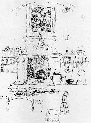 CATALOGO BIBLIOGRAFICO CARTHAPHILUS/ MILANO - PRESSO IL FOGLIO DI GUARDIA DI UN VOLUME [PIERRE SOAVI - JEAN DIODATI, "HISTOIRE DU CONCILE DE TRENTE", TROYES, CHEZ NICOLAS OUDOT, 1655] "JEAN LUIS DESPERANDIEU", VERSO IL 1666, HA DISEGNATO LA PROSPETTIVA DI UNA CUCINA SEICENTESCA DI UN CONVENTO DI FRATI MINORI. LA PREZIOSITA' DELL'IMMAGINE CONSISTE NEL FATTO CHE, A DIFFERENZA ANCHE DEI DIPINTI CHE RAPPRESENTANO LO STESSO OGGETTO, L'AUTORE DEL DISEGNO SI E' PRESO CURA DI EFFIGIARE SIN NEI MINIMI DETTAGLI E NELLA STRUMENTAZIONE LA DOTAZIONE DELLA CUCINA FRATESCA: VI SI RICONOSCONO TRA L'ALTRO FLACONI, MARMITTE, VASI, BICCHIERI, CANDELIERI, PANIERI, PIATTI, POSATE VARIE. TRAMITE UN CONFRONTO CON QUANTO NEL XIX SECOLO IPPOLITO NIEVO SCRISSE (NELLE "CONFESSIONI DI UN OTTUAGENARIO") A RIGUARDO DELLA CUCINA DEL CASTELLO DI RIPAFRATTA ("COLLEREDO") SI PUO' NOTARE LA SOMIGLIANZA CHE INTERCORREVA TRA LA CUCINA DI UN EDIFICIO MONASTICO DI REGOLARI E QUELLA DI UNA GRANDE FAMIGLIA NOBILIARE O BORGHESE