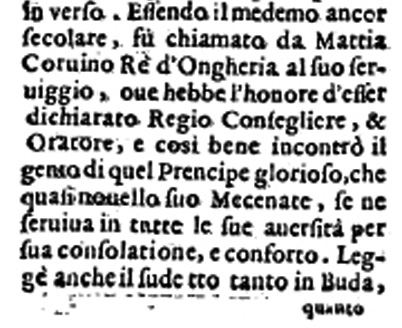 Dopo un fallito tentativo di farsi chiamare a Firenze da Lorenzo de' Medici per divenirvi abate del convento di S. Trinita (lettere a Lorenzo del 17 e 26 giugno 1488), nel 1489 il B. lasciò Roma per Buda per insegnarvi rhetoricam, forse chiamatovi da Mattia Corvino tramite l'ambasciatore ungherese a Roma Giovanni Vitéz. Alla corte ungherese rimase fino alla morte di Mattia, i cui favori poté godere solo per pochi mesi e al quale dedicò le due opere più importanti composte in quel periodo: il De humanae vitae conditione et toleranda corporis aegritudine e il De comparatione reipublicae et regni.