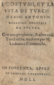 COSTUMI ET VITA DEE TURCHI DI GIO. ANTONIO MENAVINO GENOVESE DA VULTRI CON UNA PROPHETIA & ALTRE COSE TURCHESCHE TRADOTTE PER M. LODOVICO DOMENICHI