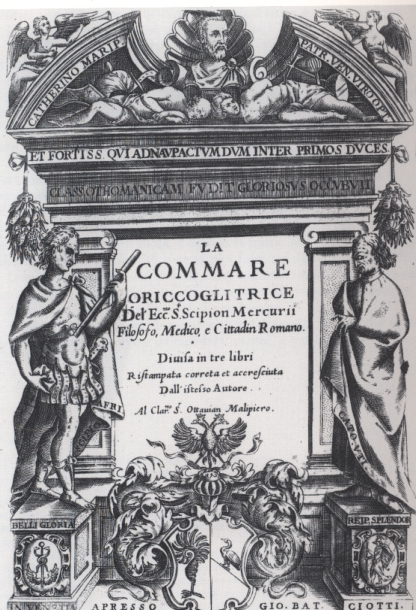 La celebre opera di GINECOLOGIA e OSTETRICIA del medico SCIPIONE MERCURI IL MERCURIALE (GIROLAMO MERCURIALE medico ostetrico domenicano nato a Roma e morto intorno al 1615. Studiņ a Padova e a Bologna. Attivo in Francia, a Bologna, nel Polesine (Lendinara) e a Roma. Il suo nome al secolo era SCIPIONE: