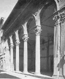 "Di fronte al palazzo Di Monte si trova l’elegante LOGGIA DEI MERCANTI [dell'antico borgo TOSCANO di MONTE SAN SAVINO], attribuita al Sansovino e costruita contemporaneamente al palazzo. Ha cinque arcate a tutto sesto sorrette da colonne di ordine corinzio, serrate da pilastri affiancati. Nei pennacchi degli archi sono riprodotti elementi disarticolati dello stemma della famiglia Di Monte. La loggia, dopo l’estinzione della famiglia Di Monte, servě a vari usi".