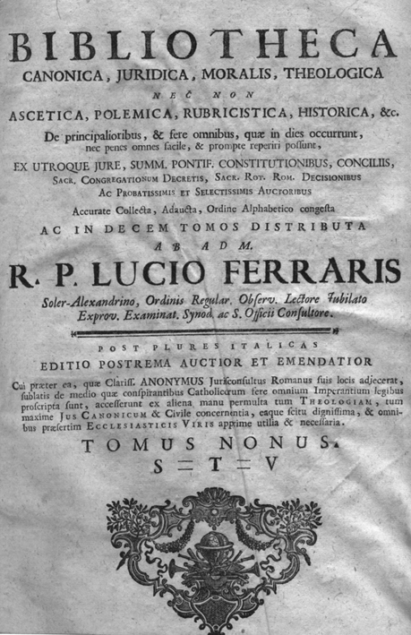 Autore del volume - questo esemplare proviene da raccolta privata - fu il teologo francescano Lucio Ferraris (1687-1763). Questa č una delle ultime edizioni pių documentate ed aggiornate: Bibliotheca canonica, juridica, moralis, theologica nec non ascetica, polemica, rubricistica, historica, &c. ... ab ad m.r.p. Lucio Ferraris ... Tomus primus [-undecimus (Additamenta)]. ..., Post plures Italicas editio postrema auctior et emendator ..., Venetiis : typis Vincentii Radici, 1770-1794 ( 11 v. ; fol - L'indicazione di ed. precede quella di partizione - Cors. ; rom - Testo su due col - Fregio xil. sui front.)
