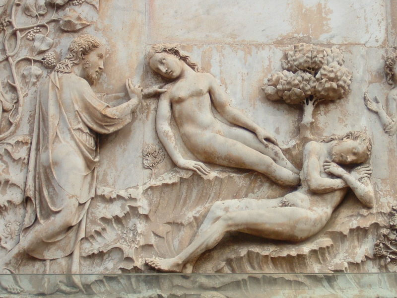 Eva viene generata dalla costola di Adamo (dettaglio della facciata del duomo di Orvieto).La creazione dei primi uomini viene narrata nel libro della Genesi secondo due versioni: la prima in 1,26-28 e la seconda in 2,7-22.
