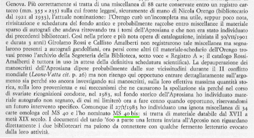 informat. Durante Per nuova catalogazione e rinvenimento di un ulteriore manoscritto i "ms 40 e ms 40 bis" sono oggi provvisoriamente nominati ms 40 EX e ms 40 bis EX: di tale puntualizzazione è necessario tenere conto nella gestione e lettura di questo oramai ultraventennale saggio = certamente le vicissitudini dell'Aprosiana, i continui trasferimenti, le guerre e nel contempo i tentativi di mettere in riparo parte di materiale, magari sfuggito nel corso dei troppi traslochi, ha causato ulteriori spostamenti del materiale aprosiano per quanto in genere codificati in merito alla sistemazione. A titolo esemplificativo si può citare il caso del "Diploma Accademico dei Geniali di Codogno" comportante l'investitura di Aprosio qual "Cavaliere Aurato e Conte Palatino" od ancora il Diploma di ascrizione di Domenico Antonio Gandolfo all'Accademia degli Incuriosi di Rossano di Giacinto Gimma e sempre del Gandolfo il Diploma di ascrizione all'Accademia Romana d'Arcadia (o restando su un campo più localistico materiale sull'erudito intemelio G. G. Lanteri o in campo più esteso copia seicentesca della Bottega dei Chiribizzi del Giudici