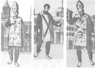 Il diritto dell'età intermedia era coronato da una scenografia finale terribile cioè la punizione pubblica del criminale o -più correttamente per l'epocale terminologia- "Reo" cosa che non era fine a se stessa ma rientrava in un meccanismo che noi abbiamo chiamato catarsi pubblica ma che nel tempo si diceva anche spettacolo di giustizia: sì un vero e terribile spettacolo in cui la punizione doveva esser un ammonimento per tutti, a non commettere più tal reato e quindi a non destabilizzare giammai il sistema dominante a rischio delle pene più terribili: e stupisce oggi - anche se non deve leggendone le ragioni- che, con altri criminali, tra i più pericolosi si ascrivessero bestemmiatori, sodomiti, omosessuali. E per maggiormente sottolineare la pubblica punizione tutto era curato nei minimi particolari: anzi al fine di risultare efficienti gli spettacoli di giustizia erano curati quali una lugubre rappresentazione persino nei percorsi da seguire e nei luoghi ove sostare onde esporsi agli scherni della folla prima di giungere al patibolo e puranco procedendo vestiti in una Maniera Vistosa ed Allusiva alle Proprie Colpe come nell'Immagine proposta oppure diversamente ma emblematicamente umiliati ancora come nel celeberrimo caso di Giordano Bruno reso invece spaventoso dall'applicazione di una "Modacchia di Ferro" anche macabro simbolo del silenzio che avrebbe dovuto piuttosto soffocare quella sua arroganza intellettuale enfatizzata da opere che scossero il Mondo ( su cui Angelico Aprosio cercò di raccogliere molto materiale attraverso l'erudito tedesco Kaspar Schoppe presente all'esecuzione e che ascoltò le ultime terribili parole del filosofo).