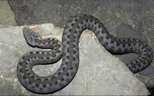 La VIPERA COMUNE (Vipera aspis, fam. Viperidi) è un serpente lungo fino a 60 cm in media, riconoscibile rispetto agli altri serpenti italiani per il capo piatto e triangolare, rivestito di piccole squame, e ben separato dal resto del corpo. Altri connotatori di questo rettile sono il muso rivolto all'insù, le squame carenate, la pupilla ellittica e verticale, il corpo massiccio, che termina in una breve coda piuttosto breve. Si alimenta principalmente di piccoli mammiferi, che uccide col veleno, iniettato con le due zanne superiori canalicolate e mobili che, a riposo, tiene ripiegate sul palato (il meccanismo di inoculazione della vipera -per quanto il suo veleno [ad effetto non neurotossico ma causa di emorragie del sistema vascolare della vittima] non sia paragonabile per potenza a quello di un mamba o di un cobra- è al limite massimo dell'evoluzione di questo apparato nei rettili (come accade anche per i crotali o serpenti a sonagli): la vipera è infatti un "Ofidio solenoglifo" un rettile cioè i cui denti velenosi sono molto grandi e vengono tenuti ripiegati contro il palato, assumendo la positura eretta solo quando la bocca viene aperta tramite un'interazione delle ossa e dei muscoli del capo. Oltre a ciò nei denti si riconosce un condotto velenifero perfettamente chiuso, che fa capo ad una ghiandola velenosa che viene premuta al momento del morso dai muscoli compressori sicché il veleno è inoculato a pressione attraverso il dente, entrando più velocemente nel circolo sanguigno della vittima: il vantaggio per un serpente velenoso dotato di questo meccanismo di attacco consiste nel dover rimanere pochissimo a contatto della vittima ed in grado di attendere al sicuro, senza rischio di pericolose reazioni dell'aggredito, che il veleno compia il suo effetto).