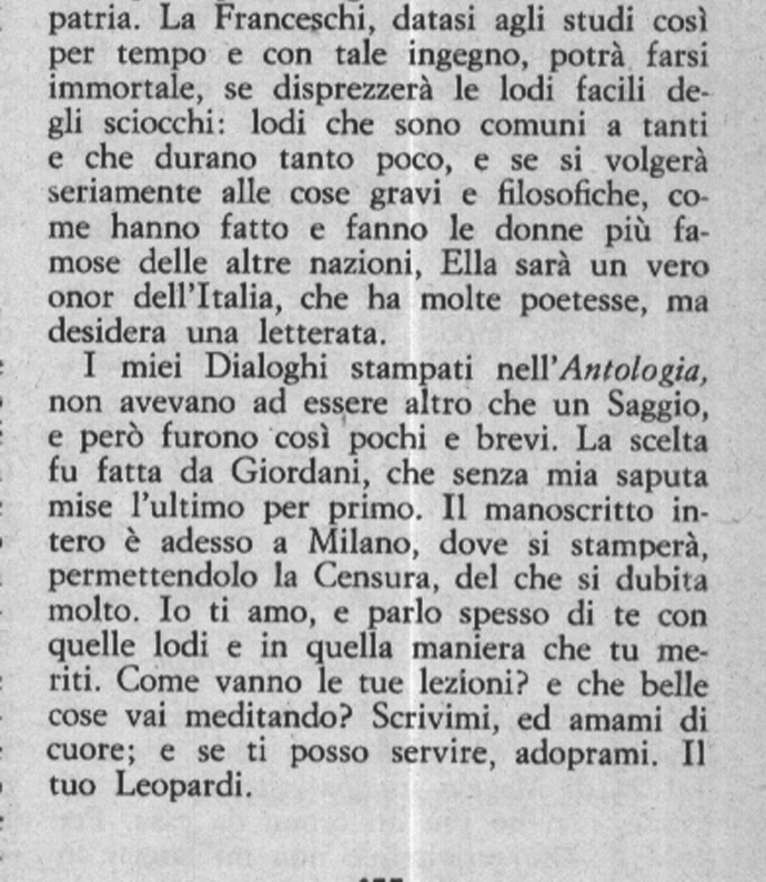 Leopardi parla ancora della Franceschi esortandola a non farsi tentare dalla poesia ma piuttosto dalla filosofia sì da diventare una luminare per l'Italia