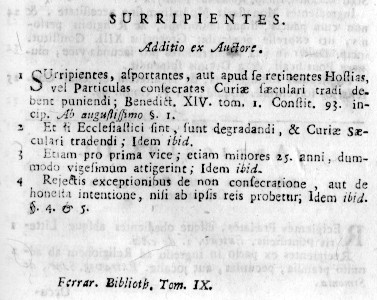 NELL'IMMAGINE, DA TESTO CANONICO, SI VEDE LA REGISTRAZIONE DEGLI ESTREMI DI UNA COSTITUZIONE PONTIFICIA DI BENEDETTO XIV (CITATA AD INTEGRAZIONE DELLA VOCE SUPERSTITIO) IN MERITO AL REATO DI ASPORTAZIONE DI OSTIE CONSACRATE : IL TUTTO ERA SANCITO (E SAREBBE STATO RIBADITO IN ALTRE COSTITUZIONI ANCORA) ONDE EVITARE CHE SI UTILIZZASSERO DELLE OSTIE CONSACRATE NELLA PRATICA DI SORTILEGI, DI MESSE NERE ED ANCOR PIU' ESTESAMENTE NELL'ORGANIZZAZIONE DI SABBA DIABOLICI