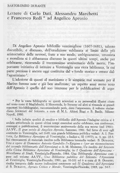 PAGINA 1 DI 18 - CLICCA QUI PER VOLTARE PAGINA: NELL'IMMAGINE SAGGIO DI BARTOLOMEO DURANTE (LETTERE DI CARLO DATI, ALESSANDRO MARCHETTI E FRANCESCO REDI AD ANGELICO APROSIO) PUBBLICATO IN "CRITICA LETTERARIA", 1986, N. 56, PP. 564 - 580