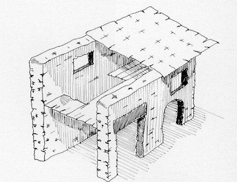 IN QUESTA ALTRA ABITAZIONE SEMIPERMANENTE PER PASTORI SI VEDE L'APERTURA PER IL PASSAGGIO DEL FIENO CHE CADE DIRETTAMENTE SULLA MANGIATOIA. IL PAVIMENTO DEL PIANO ERA IN TERRA BATTUTA E COL TEMPO, IMBEVENDOSI DEI DETRITI ANIMALI, RENDEVA L'ARIA QUASI IRRESPIRABILE
