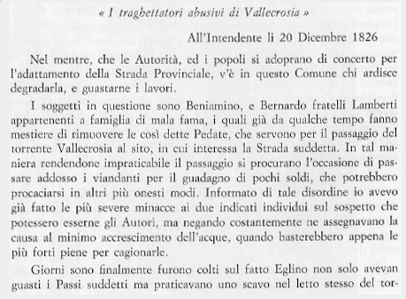 A QUESTO PROPOSITO E' UN DOCUMENTO EMBLEMATICO LA PETIZIONE DELLA MUNICIPALITA' DI VALLECROSIA (ATTO CONSILIARE DEL 20-XII-1826 IN ARCHIVIO COMUNALE DI VALLECROSIA) CON CUI SI DENUNCIAVANO (COME QUI SOPRA SI PUO' BEN LEGGERE) DUE LOSCHI FIGURI CHE, IN TEMPO DI ACQUA ALTA, RIMUOVEVANO LE PEDATE DEL GUADO PER COSTRINGERE LA POVERA GENTE A SERVIRSI DEL LORO SERVIZIO, A PAGAMENTO, QUALI TRAGHETTATORI.