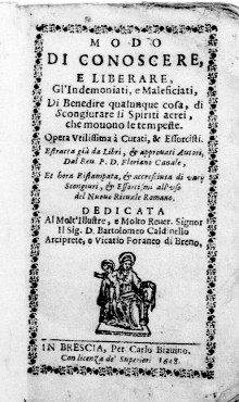 E' QUESTO IL FRONTESPIZIO DELLA RARISSIMA EDIZIONE ORIGINALE DELL'OPERA DI FLORIANO CANALE INTITOLATA "DEL MODO DI CONOSCERE ET SANARE I MALEFICIATI..., SONO AGGIONTE VARIE CONGIURATIONI & ESSORCISMI CONTRO LA TEMPESTA E CATTIVI TEMPI MOSSI DA MALIGNI SPIRITI", BRESCIA, PER G. B. GROMI, 1648, VOL. IN 8°