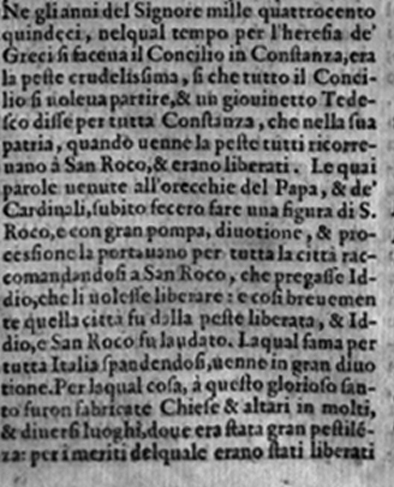 Vedi qui il Concilio di Costanza (testo in italiano) e l'interpetazione datane dal controverso (Porterus) = in merito ai miracoli taumaturgici di S. Rocco questa sarcina narrativa č tratta dal Leggendario delle vite de' santi. Composto dal R.P.F. Giacobo di Voragine, ... tradotto giā per il R.D. Nicolo Manerbio. Nuouamente ridotto a miglior lingua, riformato, purgato da molte cose souerchie, arricchito de' sommarij, di vaghe figure ornato, e ristampato. Con l'aggiunta di calendario, lunario, & feste mobili ..., In Venetia : appresso Alessandro Griffio, 1584, qui digitalizzato, si integra con le postulazioni dell'anonimo autore del libretto del 1907 sulla chiesa vallecrosina di S. Rocco che alle pagine 16-24 tratta della