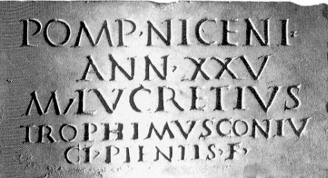 L'interpretazione POMPONIA fu suggerita da N. Lamboglia in Il Civico Museo "Girolamo Rossi" e le altre collezioni locali di oggetti albintimiliesi, in "Rivista Ingauna Intemelia", 4 (1838), p.170, n.8: interpretazione quindi ripresa da molti studiosi oltre che dallo stesso Lamboglia in Ventimiglia Romana, Bordighera, 1964 (lavoro poi ripreso ed aggiornato assieme a F. Pallarés: pp.147, figura 125) e ancora da Giovanni Mennella in Supplemento agli Indici onomastici di CIL (Liguria - Alpes Maritimes) in "SupplIt.", n.s., 1 (1981), p.195 (oltre che nel suo Lapidario del nuovo Museo Archeologico di Ventimiglia in "Epigraphica", 52, 1990, p.229. La lettura POMPEIA è dipendente dall'idea di confortare vieppiù testimonianze di una presenza, peraltro già provata, di POMPEII in Ventimiglia romana [l'appiglio critico è suggerito dal fatto che "tendenzialmente" ma non "necessariamente" l'abbreviazione per Pompeius sarebbe di 4 lettere (Pomp) e per Pomponius di 6 cioè Pompon]: si tratta comunque di una lapide funeraria in cui l'innamorato sposo Lucrezio Trophimus ricorda ai posteri la dolorosa perdita della venticinquenne sposa POMPONIA (o POMPEIA) NICENA