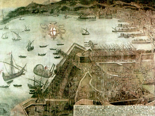 Nell'immagine informatizzata da B. Durante lo "SCAVO DEL MANDRACCIO" fatto nel 1575 e qui effigiato, in un suo quadro oggi custodito al "Civico Museo Navale di Genova", da Dioniso de Martino