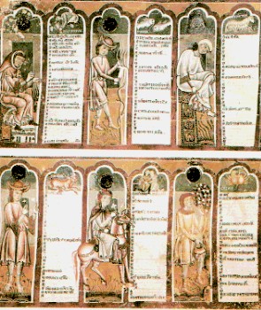 A fronte dell'assenza di sedi ufficiali in cui proporre i diversi CALENDARI interviene solitamente la CHIESA: soprattutto in Italia e in Francia abbondano calendari dipinti, lavorati a mosaico o scolpiti all'interno degli stessi edifici religiosi (anche su fonti battesimali o capitelli) oppure, e quasi con maggior frequenza, variamente effigiati sulla facciata delle varie chiese. Si tratta di un modo per fornire ai FEDELI uno STRUMENTO NON COMUNE PER CLASSIFICARE IL SUCCEDERSI DEI GIORNI. Nel XIII secolo la DIFFUSIONE DEI CALENDARI MONUMENTALI si intensifica proprio in rapporto all'aumento dei viaggi e all'arrivo in molte località di tanti PELLEGRINI, della fede e non. Questa fondamentale necessità di tenere il computo dei giorni, sia per ragioni comuni che per gli impegni liturgici ed agronomici, incentiva poi dal XIV secolo il fenomeno dei LIBRI D'ORE preziosissime opere miniate (e in origine, naturalmente manoscritte) in cui sono uniti il CALENDARIO, l'UFFICIO DELLA VERGINE, il SALTERIO (come nel caso di questo prezioso ESEMPLARE DI "LIBRO D'ORE" custodito alla BIBLIOTECA APROSIANA DI VENTIMIGLIA.