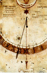 Vedi ingrandita l'immagine della Meridiana La MERIDIANA del chiostro dell'ABBAZIA DI NOVALESA è il simbolo dello strumento per eccellenza della misurazione del tempo nel medioevo. Le MERIDIANE od OROLOGI SOLARI, diffuse nell'antichità e portate ad estremo perfezionamento dai ROMANI (che peraltro perfezionarono altre misurazioni del tempo giornaliero, per esempio con l'introduzione della CLESSIDRA) nel medioevo tornarono alla loro forma più semplice e furono frequentemente costruite sull'esterno delle chiese per dare ai fedeli la possibilità di misurare lo scorrere del tempo. Ben si intende che il limite delle MERIDIANE risiedeva nell'impossibilità di fornire una misurazione del tempo notturno o del tempo in caso di assenza di sole (non sussisteva invece o comunque era relativo il problema di avere MERIDIANE PORTATILI, che in effetti furono realizzate). Il problema basilare ed irrisolvibile (quella dell'impossibilità di una misurazione del tempo in assenza dei raggi solari) sulla scorta dell'influenza degli apparecchi meccanici realizzati da orientali ed arabi, si cominciò a risolvere in Europa con apparecchi, pur enormi ed imprecisi, solo dal XIV secolo (e col ripristino dell'uso frequente delle CLESSIDRE). Nel medioevo il giorno era mediamente diviso nelle 12 ore del giorno e nelle 4 veglie (ciascuna di 3 ore della notte). Ore fondamentali per la misurazione del tempo erano: l'"UN'ORA" (ora prima della notte dopo l'Ave Maria - detta anche ORA DI NOTTE) cui succedevano le ORE PICCINE o PICCOLE (quelle comprese fra la MEZZANOTTE e il SORGERE DEL SOLE), le ORE DEL MATTINO o ANTIMERIDIANE (quelle comprese tra la mezzanotte di un giorno e il mezzogiorno del successivo) e soprattutto l'ORA NONA (ORA DI NONA) corrispondente alle nostre ORE 15 cioè le TRE DEL POMERIGGIO in cui per convenzione era posta la MORTE DEL REDENTORE. Per i VIANDANTI DELLA FEDE (ma nell'età intermedia un pò per tutti i fedeli e pergli stessi laici) aveva però un'importanza uguale, se non superiore, a quella dell'ORARIO SOLARE il così detto ORARIO CANONICO od ORARIO REGOLARE che aveva il ragguardevole pregio di essere sottolineato alle comunità con un utilissimo e storico SEGNALE ACUSTICO quello del SUONO DELLE CAMPANE sì da diventare il modo principale per la regolamentazione unitaria della VITA SOCIALE. Col termine di ORA CANONICA o ORA REGOLARE si indicava ognuna delle 8 parti in cui è diviso l'UFFICIO DIVINO e la cui recita avviene in esatti istanti del sì e della notte. MATTUTINO dopo la mezzanotte, LODI al canto del gallo, ORA PRIMA alle 6, ORA TERZA alle 9, ORA SESTA alle 12, ORA NONA alle 15, VESPRO verso le 18, COMPIETA prima del riposo (informatizzazione a cura di B. Durante)