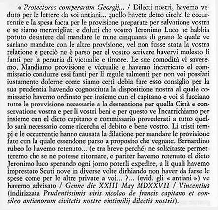lettera con cui i "Protettori del Banco di S. Giorgio" nel 1527 iniziarono una corrispondenza con le autorita' di Ventimiglia: vi si fa cenno a danni gravi ricevuti da soldati. Il decorso della corrispondenza permette l'odentificazione di queste truppe con quelle del Connestabile di Borbone (edita e qui ripresa in "Storia della Magnifica Comunità...")