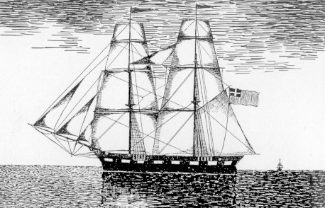 "BRIGANTINO PER IL TRASPORTO DEGLI EMIGRANTI AL PLATA nel 1855 (DISEGNO DI GIO. BONO FERRARI)" [DAL VOLUME DI NICCOLO' CUNEO STORIA DELL'EMIGRAZIONE IN ARGENTINA (1810-1870), MILANO, 1940]: VEDI ORA IMMAGINE DI ALTRO VASCELLO ANCORA