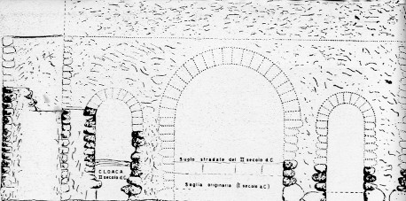 POSSIBILISTICA RICOSTRUZIONE DELLA PORTA PRAETORIA: SI VEDE NELL'IMMAGINE IL SOPRAELEVAMENTO DELL'ASSETTO STRADALE E SOPRATTUTTO LA REALIZZAZIONE DELLA CLOACA MAXIMA CIOE' DEL CONDOTTO FOGNARIO PRINCIPALE CHE PARTIVA DA POCO DOPO IL COMPLESSO DEL TEATRO E PROCEDEVA IN DIREZIONE EST PER SCARICARE I LIQUAMI CHE VIA VIA RACCOGLIEVA (ANCHE DA CONDOTTI E SCARICHI MINORI CHE IN ESSA CONFLUIVANO) NELLE ACQUE DEL NERVIA.