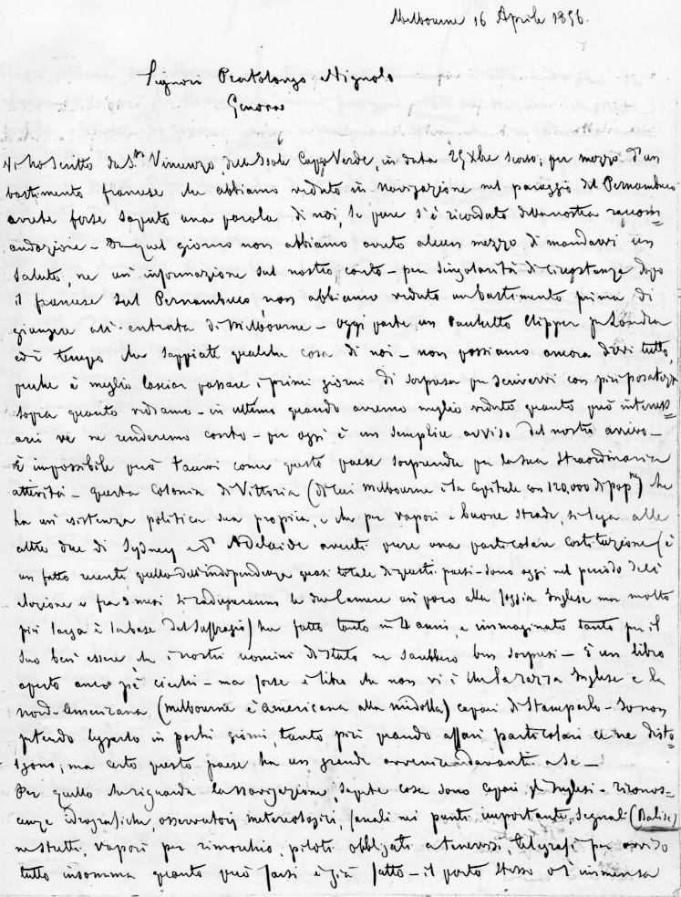 L’inedito qui proposto, datato Melbourne 16 Aprile 1856, dovrebbe collocarsi nel I volume della Morelli (lettere di Bixio tra il 1847 ed il 1860) dopo la lettera che sempre da Melbourne Nino Bixio indirizzò a Genova alla moglie Adelaide il 15 aprile 1856 (pp.140-143, classificata come "Lettera LXXVIII") cui invece nell’opera di Emilia Morelli segue la celebre epistola (Melbourne, 24 maggio 1856 classificata "Lettera LXXIX", pp.143-146) in cui Bixio, sempre scrivendo alla consorte, riproduce alcune sarcine della lettera da noi sopra editata, depennando le considerazioni commerciali ed inserendo nuove descrizioni del panorama australiano, sia demico che geografico.