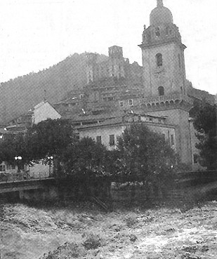 LA CHIESA PARROCCHIALE NEL COMPLESSO DEMICO DI DOLCEACQUA: VISTA DEL CAMPANILE E DEL LATO PROSPICIENTE AL TORRENTE NERVIA. SI COMPRENDE DALL'IMMAGINE DEL TORRENTE IN PERICOLOSA PIENA (OTTOBRE 2000) IL TERRIBILE MECCANISMO DELLE SUE ANTICHE ALLUVIONI (QUANDO PERALTRO GLI ARGINI ERANO MEDIAMENTE MENO SALDI DEGLI ATTUALI) ED IN PARTICOLARE DI QUELLA SETTECENTESCA DETTA DEGLI "ANGELI CUSTODI"