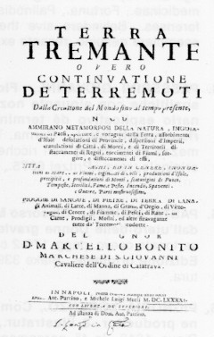 NELL'IMMAGINE SI VEDE IL FRONTESPIZIO DELL'OPERA ORIGINALE, MOLTO RARA, DI MARCELLO BONITO INTITOLATA TERRA TREMANTE, OVERO CONTINUAZIONE DE TERREMOTI DALLA CREATIONE DEL MONDO SINO AL TEMPO PRESENTE, IN CUI S'AMMIRANO METAMORFOSI DELLA NATURA, INGOIAMENTI DI PAESI, APERTURE E VORAGINI DELLA TERRA, ASSORBIMENTI D'ISOLE, DESOLATIONI DI PROVINCIE, DISPERSIONI D'IMPERI, TRASLAZIONI DI CITTA', DI MONTI E DI TERRITORI...CITTA' RIDOTTE IN LAGHI, ED IN CENERE, INONDAZIONI DI MARE E DI FIUMI, ERGIMENTI DI COLLI, PRODUTTIONI D'ISOLE, PRECIPITII, E PROFONDATIONE DI MONTI...TEMPESTE, STERILITA', FAME E PESTE, INCENDI, SPAVENTI, E GUERRE. PARTI MOSTRUOSISSIMI, PIOGGE DI SANGUE, DI PIETRE, DI TERRA, DI LANA, DI ANIMALI, DI LATTE, DI MANNA, DI GRANO, D'ORGIO, DI VITTOVAGLIE, DI CENERE, DI FIAMME, DI PESCI, DI RANE, E DI CARNE, PRODIGII, MOSTRI ED ALTRE STRAVAGANZE DA' TERREMOTI PRODOTTE, NAPOLI, PERRINO & MUTII, 1691: DOCUMENTO CUSTODITO PRESSO BIBLIOTECA PRIVATA