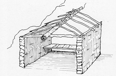 SI VEDE QUI SOPRA UN'ABITAZIONE SEMIPERMANENTE DI VAL VERDEGGIA. L'ARMATURA DEL TETTO E' COSTITUITA DA UNA TRAVE E DA PALETTI TRASVERSALI. ESSA VENIVA QUINDI RICOPERTA CON ZOLLE D'ERBA CHE, A FINE STAGIONE, ERANO TOLTE NON ESSENDO IDONEE A REGGERE IL PESO DELLA NEVE