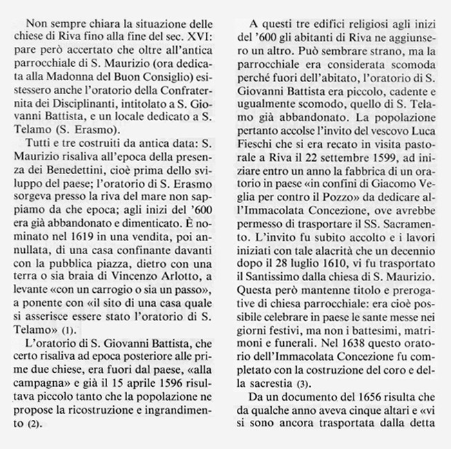 La presente relazione sulle antiche chiese di Riva Ligure è costituita da un articolo di NILO CALVINI, uno dei più illustri studiosi e storici che il Ponente ligure possa vantare e la cui recente scomparsa è stata una grave perdita. Alla sua prosa asciutta ed ai suoi contenuti rigorosi sono infatti da ascrivere alcuni irrinunciabili contributi per la conoscenza del Ponente di Liguria. E' parso giusto, nella realizzazione di questo "CD - GIUBILEO2000" dedicato alle vicende storiche della "Provincia di Imperia", ricordarlo col proporre integralmente un suo straordinario contributo critico (già edito sulla Rivista della Camera di Commercio di Imperia la "Riviera dei Fiori", N.S., 1992, 1). Un lavoro mirabile (costruito pazientemente soprattutto su documenti di archivio e "lottando" contro tante lacune informative) cui il Calvini stesso diede l'emblematico titolo di: "Gli edifici religiosi a Riva Ligure nel XVII secolo. Le pratiche per la costruzione della chiesa parrocchiale"