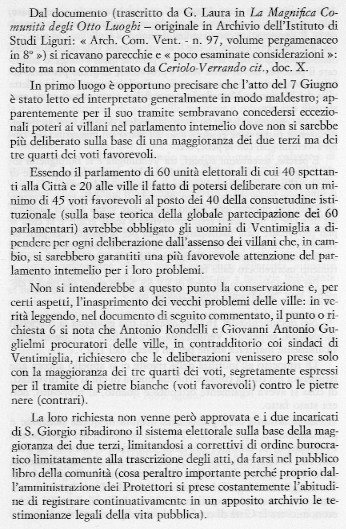 ATTESI CERTI CONTRASTI TRA VENTIMIGLIA E LE SUE VILLE NELLA GESTIONE DEL LOCALE PARLAMENTO IL 7 GIUGNO 1543 DUE ESPONENTI DEL COLLEGIO DEI PROTETTORI DEL BANCO DI S. GIORGIO, GIOVANNI IMPERIALE E ANTONIO DE FORNARI CON LE LORO ORDINAZIONI, ED ALLA PRESENZA DEI RAPPRESENTANTI DELLE VILLE ANTONIO RONDELLI E GIOVANNI ANTONIO GUGLIELMI E DI VENTIMIGLIA I MAGNIFICI BATTISTA GALEANI E LUCA SPERONE, AVEVANO TENTATO UNA COMPOSIZIONE IN 36 CAPITOLI DEI RAPPORTI SOCIO-ECONOMICI FRA LA CITTA' DI CONFINE E LE SUE DIPENDENZE RURALI.
