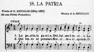 PRESSO IL "MUSEO DELLA CANZONE DI VALLECROSIA SI CONSERVA LO SPARTITO DI UN'ANTICO CANTO POPOLARE PIEMONTESE DEDICATO ALLA PATRIA, DALL'INCIPIT CHE SUONA CON LE PAROLE LA PATRIA, LA PATRIA: ESSO VENNE EDITATO SU UNA OTTOCENTESCA RIVISTA LETTERARIO-MUSICALE PIEMONTESE E RISULTA UNA "POESIA" DI G. B. NICCOLINI (1824-1887) MUSICATA DA A. NICCOLINI.
