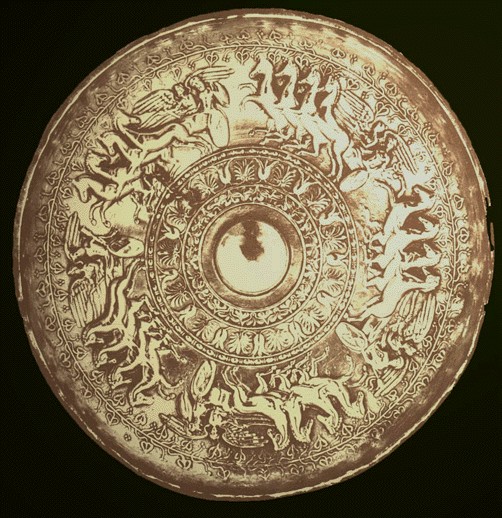 Piatto d'argento (o "Patera") attribuito all'arte greca, fu trovato ad Eze verso 1870 nel corso di scavi archeologico sul sito dove si sviluppò e crebbe l'insediamento gallo-romano. Un reperto tipologicamente simile pervenne invece per donativo al londinese British Museum. La "Patera" (dal diametro di 21,4 cm.) è tuttora custodita al Museo Archeologico di Nizza. La rappresentazione che si può facilmente leggere sulla "Patera" è di una certa raffinatezza: si può contemplare una ben disposta sequenza di quadrighe con figure femminili alate, forse da connettere coi prodotti della cultura celtica nel suo graduale processo di accostamento all'ambiente classico greco-romano. Questo prodotto di ottima oreficeria è da porre in relazione all'ambiente sociale dei LIGURI ANTICHI e qui specificatamente i VEDIANTII che, verso il III - II sec. a.C. sulla collina Kamenelon (Cimiez) realizzarono un oppidum, un centro fortificato, che, successivamente alla conquista romana, Augusto trasformò nella sede della Prefettura della Provenza nel 14 a.C col nome di Cemenelum. Sin dai primi tempi dell'Impero la città godette di un forte incremento demografico e soprattutto di una rilevante attività edilizia: vi furono realizzati ben tre ordini di terme e l'anfiteatro [ oltre le Terme fu rinvenuta il fondo stradale a Sud del complesso archeologico romano che fu anche il punto d'incrocio d' importanti vie romane della Gallia Narbonese si distinguono molto bene in fremmento della via Julia]. Gli studiosi hanno poi individuato nella piana delle Cimiez sovrastante Nizza, presso l'oppidum ligure, i resti di una necropoli preromana