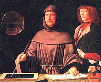 Jacopo de' Barbari, Ritratto di Fra Luca Pacioli con un allievo (Guidobaldo da Montefeltro?) 1495[Napoli, Museo e Gallerie di Capodimonte olio su tavola, cm. 99x120]