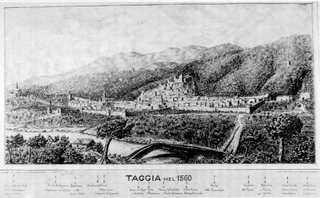IN QUESTA VEDUTA DI TAGGIA RIPRESA DA UN'OPERA DI NILO CALVINI SI POSSONO VEDERE LE FORTIFICAZIONI DI TAGGIA AL TEMPO DELL'INVASIONE BARBARESCA.