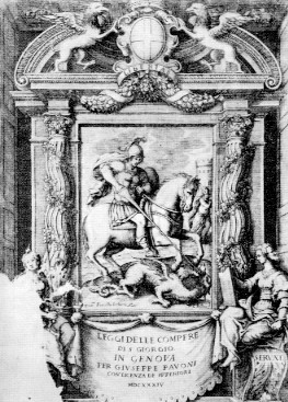 Frontespizio delle LEGGI DELLE COMPERE DI S. GIORGIO stampate a Genova dal Pavoni nel 1634: il frontespizio è stato realizzato su un'incisione in rame realizzata su un disegno del celebre pittore Domenico Fiasella (ARCH. APROSIANA -INF. DURANTE)
