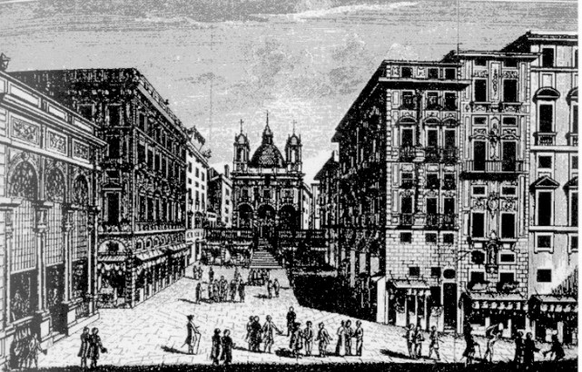 LA PIAZZA COMMERCIALE GENOVESE DI BANCHI IN UNA STAMPA D'EPOCA