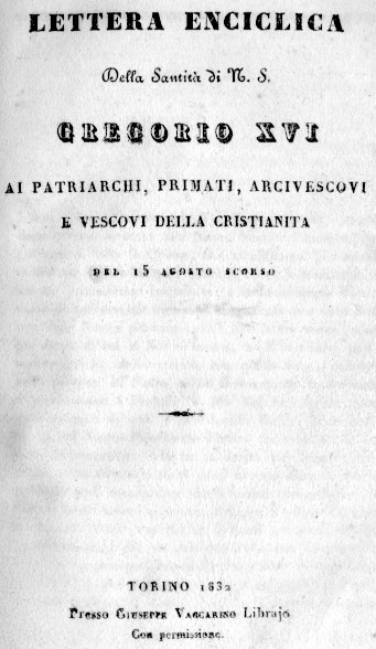una VERSIONE di quella LETTERA ENCICLICA MIRARI VOS (del 15 agosto 1832) del PONTEFICE ROMANO GREGORIO XVI che ha i connotati, ancor più che di richiamo alla fedeltà dei popoli rivoltosi dello STATO DELLA CHIESA, di severa risposta al MEMORANDUM congiuntamente inviatogli l'anno precedente dalle principali potenze (Austria, Prussia, Francia, Inghilterra, Regno di Sardegna) onde provvedere ad una serie di adeguate riforme amministrative e giuridiche del suo arretrato Stato.