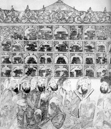 RAPPRESENTAZIONE DI UNA BIBLIOTECA ARABA NELLA MINIATURA DEL PITTORE AL-WASITI PER UNA DELLE CINQUANTA MAQAMAT (COMPONIMENTI IN PROSA RIMATA), OPERA DEL FILOLOGO E LETTERATO AL-HARIRI DEL 1237: DOCUMENTO CUSTODITO ALLA BIBLIOTECA NAZIONALE DI PARIGI