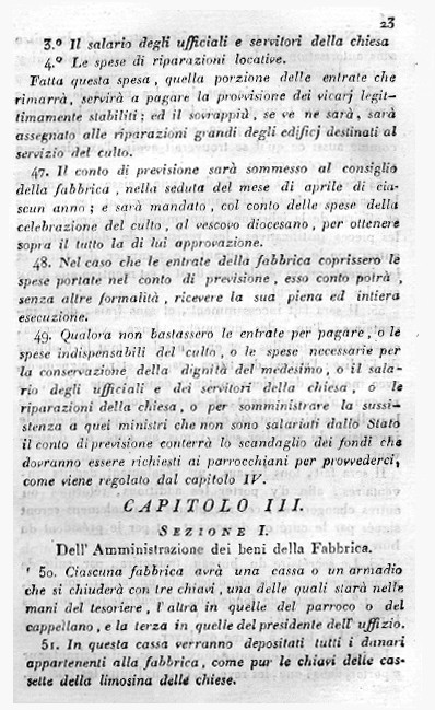 COPIA ITALIANA DEL DOCUMENTO ORIGINALE DEL DECRETO IMPERIALE CONCERNENTE LE FABBRICHE (PROMULGATO NEL "PALAZZO DELLE TUILLERIE, IL DI' 30 DICEMBRE 1810") CON CUI NAPOLEONE BONAPARTE RIORGANIZZO' AMMINISTRATIVAMENTE TUTTA LA STRUTTURA PORTANTE DELLA CHIESA CATTOLICA DEL SUO IMPERO: LA COPIA IN OGGETTO FU STAMPATA IN REDAZIONE BILINGUE (FRANCESE ED ITALIANA) DALLO STAMPATORE DI CUNEO PIETRO ROSSI NELL'ANNO 1811