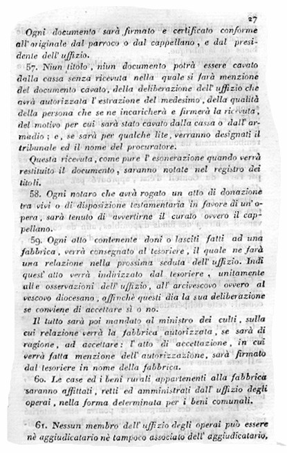 COPIA ITALIANA DEL DOCUMENTO ORIGINALE DEL DECRETO IMPERIALE CONCERNENTE LE FABBRICHE (PROMULGATO NEL "PALAZZO DELLE TUILLERIE, IL DI' 30 DICEMBRE 1810") CON CUI NAPOLEONE BONAPARTE RIORGANIZZO' AMMINISTRATIVAMENTE TUTTA LA STRUTTURA PORTANTE DELLA CHIESA CATTOLICA DEL SUO IMPERO: LA COPIA IN OGGETTO FU STAMPATA IN REDAZIONE BILINGUE (FRANCESE ED ITALIANA) DALLO STAMPATORE DI CUNEO PIETRO ROSSI NELL'ANNO 1811