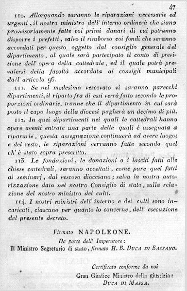 COPIA ITALIANA DEL DOCUMENTO ORIGINALE DEL DECRETO IMPERIALE CONCERNENTE LE FABBRICHE (PROMULGATO NEL "PALAZZO DELLE TUILLERIE, IL DI' 30 DICEMBRE 1810") CON CUI NAPOLEONE BONAPARTE RIORGANIZZO' AMMINISTRATIVAMENTE TUTTA LA STRUTTURA PORTANTE DELLA CHIESA CATTOLICA DEL SUO IMPERO: LA COPIA IN OGGETTO FU STAMPATA IN REDAZIONE BILINGUE (FRANCESE ED ITALIANA) DALLO STAMPATORE DI CUNEO PIETRO ROSSI NELL'ANNO 1811