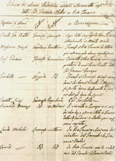 ELENCO DEGLI ADERENTI ALLA "GIOVINE ITALIA" IN RIO DE JANEIRO, TRASMESSO DAL VICE LEGATO DI POLIZIA IN VELLETRI AL GOVERNATORE DI CORI. TRA I VARI NOMINATIVI COMPARE ANCHE QUELLO DI GARIBALDI. VELLETRI, 17 NOVEMBRE 1838 (DOCUMENTO IN ARCHIVIO DI STATO DI LATINA, GOVERNO DI CORI, SERIE VII, ATTI DI POLIZIA, B. 222, FASC.16920, N.6/2)