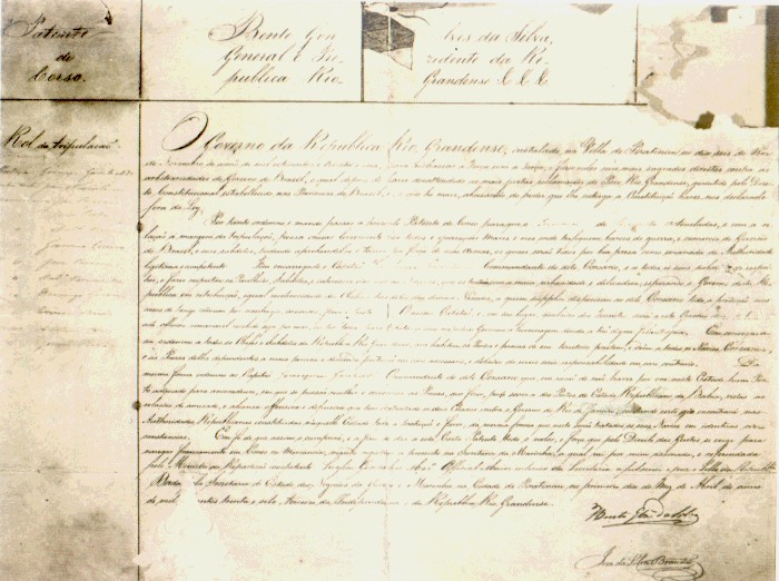 Pertanto ordino e decreto la presente PATENTE DI CORSARO acciocché la Zumaca Farropilha del peso di 120 tonnellate escluso l'equipaggiamento possa percorrere liberamente tutti i mari e i fiumi dove transitano navi da guerra e mercantili del Governo del Brasile e dei suoi sudditi, che, se presi con la forza delle armi, saranno considerati bottino di guerra come prescritto dall'Autorità legittima e competente. Si raccomanda il Capitano Giuseppe Garibaldi, comandante della detta nave corsara e tutti i suoi subalterni di rispettare e di fare rispettare le bandiere, i sudditi e gli interessi delle altre Nazioni, e di trattarli con la massima urbanità e delicatezza; augurandoci che il Governo di questa Repubblica contraccambi i Capi ed i Sudditi delle altre Nazioni, ai quali chiedo di concedere alla detta nave corsara tutta la protezione in caso di pericolo comune per naufragio, incendio, fame e peste. Lo stesso capitano e, in sua vece, qualsiasi tenente darà a questo Governo l'aiuto necessario ricevuto sia per mare che per terra, per tributare ai rispettivi Governi gli onori dovuti a tale degna filantropia. In conseguenza ordino a tutti i Capi e Sudditi della Repubblica Riograndese che abitano i porti e le spiagge del suo territorio di offrire e dare a tutte le navi corsare e alle persone da loro dipendenti la più attenta e devota protezione in caso di bisogno e in caso contrario sotto la più grave responsabilità. Nella medesima forma ordino al Capitano Giuseppe Garibaldi comandante della detta nave corsara in ragione del fatto che, per ora, in questo Stato non esiste nessun porto adatto all'attracco e nel quale si possa raccogliere e conservare i bottini fatti, di servirsi dei porti dello Stato della Repubblica di Bahia, considerando le relazioni di amicizia e di alleanza offensiva e difensiva che hanno contratto i due Stati contro il Governo